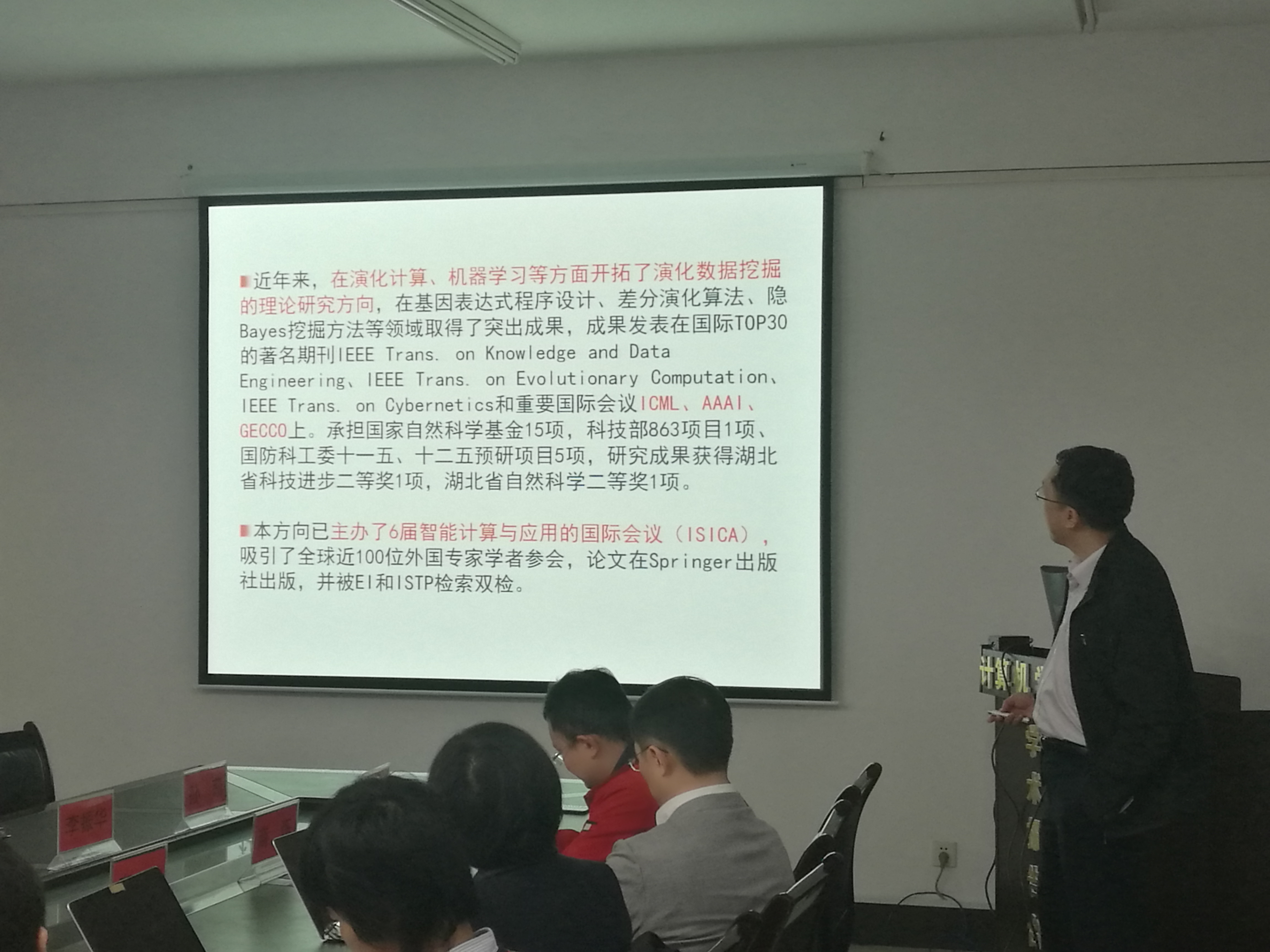 之后各位学者们分别就自己的研究成果进行了报告。来自澳大利亚迪肯大学的朱天清博士做了题为《大数据环境下差分隐私保护的理论基础和应用前景》的学术报告、来自澳大利亚昆士兰大学的武琳博士做了题为《Advancing Deep Learning into Intelligent Surveillance Systems》的学术报告、来自日本会津大学的李鹏博士做了题为《Resilient Computing and Communication Infrastructure for Disaster Management》的学术报告、来自美国匹兹堡大学的郑锋老师做了题为《Research and Application of Fast Algorithm in Large-Scale Multimedia Data》的学术报告、来自沙特阿卜杜拉国王科技大学的商烁做了题为《Trajectory Similarity Join in Spaital Networks》的学术报告。各位老师们聚精会神的听取了各位学者们的报告,随后与学者们进行了深入的沟通交流。