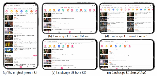 通过在数十款真实开源应用上进行评估,并与AUAG、Rotation以及多模态大模型等方法进行对比。结果表明,UI-LAND在分类准确率(92.3%)、类内距离(37.7%)和UI偏差(21.2%)等指标上均优于基线方法,生成结果更接近开发者设计的UI。图1展示了UI-LAND和其他基线方法在进行横屏转换时的可视化表现。
