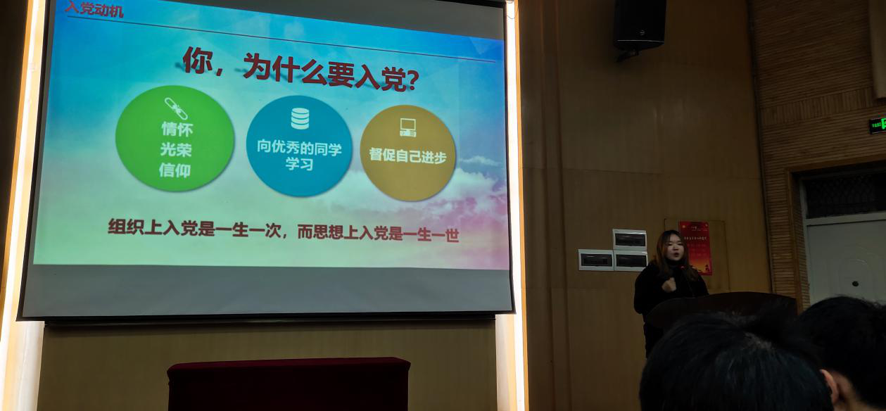 杨学姐通过与同学们的互动展开了自己的宣讲。她详细的介绍了入党的要求、条件。同学们具备的思想觉悟和准备,肯定了积极向党组织靠拢的同学。她还向大家展示了由她组织带队的以宣传党的历史为主题的活动及收获,坚定了同学们向党组织靠拢的决心。