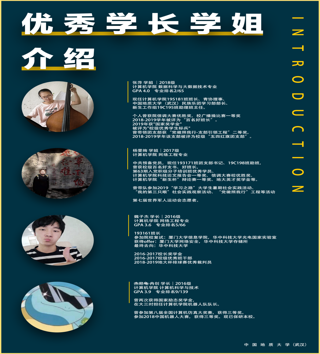 接下来是16级网络工程专业魏子杰学长,魏子杰学长学分绩点为3.6,专业排名第五,担任193161班班长,参加了厦门大学信息学院和华中科技大学光电国家实验室的复试,并获得了进入厦门大学网络安全和华中科技大学存储所的保研资格,最终保研华科;他2016-2017学年获得校长奖学金,“校级优秀班干部称号”,2018-2019学年被评为“地大杯”排球赛优秀裁判员。