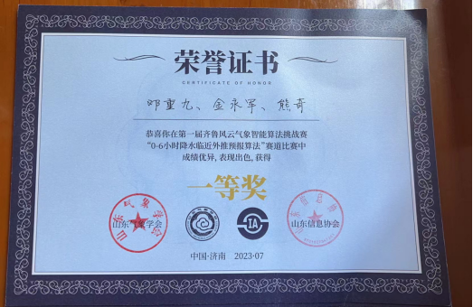 7月15至16日,由山东气象学会、浪潮数字(山东)建设运营有限公司、山东信息协会联合主办的第一届齐鲁风云气象智能算法挑战赛决赛及颁奖仪式在济南完美收官。历经初赛、复赛、决赛的层层选拔和激烈角逐,成人av 教师刘佳指导的研究生邓重九、金永军、熊奇组成的团队获得“0-6小时降水临近外推预报算法”赛道一等奖。