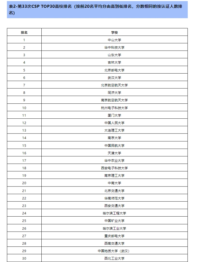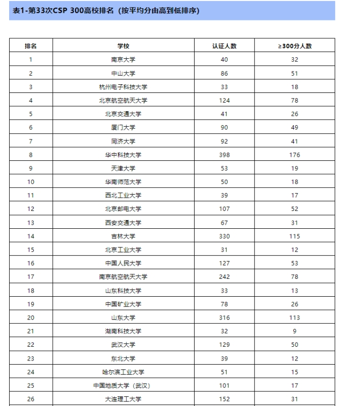 此次认证共有来自240个高校或单位的7672人参加了认证。我校共101人参加认证考试,其中300分以上达17人(CSP总分500分)。CCF对参加人数大于等于30人且2人及以上认证成绩达300分的高校进行了平均分排名,成人av 排名第二十五。此外,CCF对每所学校排名前20同学的成绩进行了平均分排名,产生了CSP TOP30高校,成人av 排名第二十九。