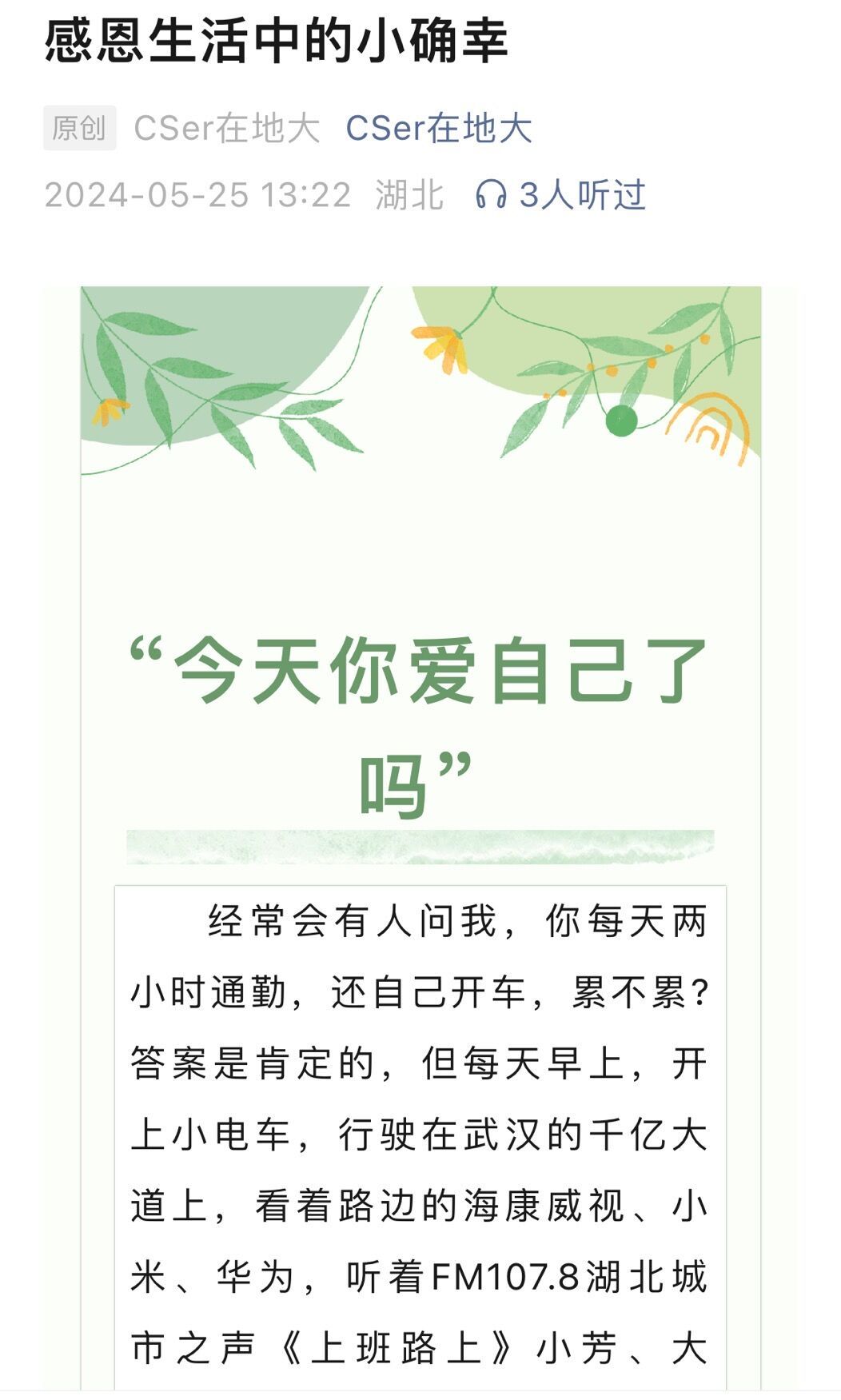 5·25全国大学生心理健康日当天,学院官方公众号“CSer在地大”发布了《感恩生活中的小确幸》,学工组全体老师为同学们送上祝福与期许,鼓励大家在生活中发现爱、感受爱、传递爱,学会享受生活中的小确幸,也祝愿CSer能在成人av 感受到更多细碎而确切的幸福。