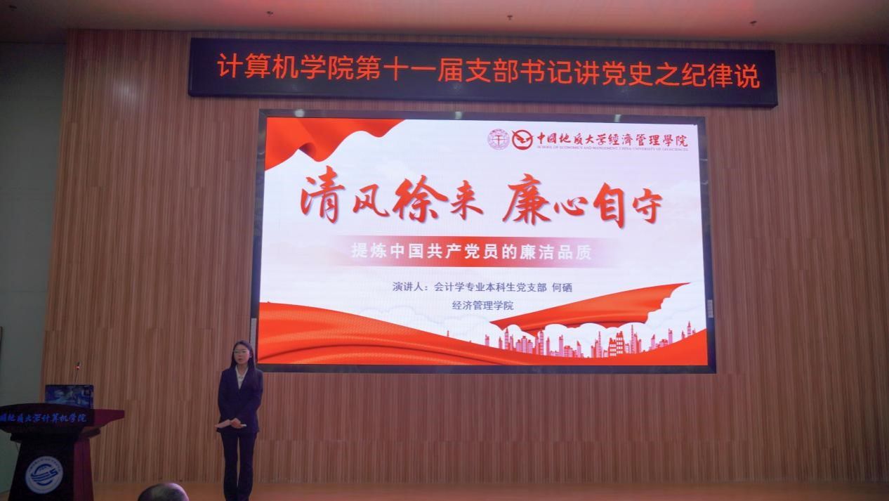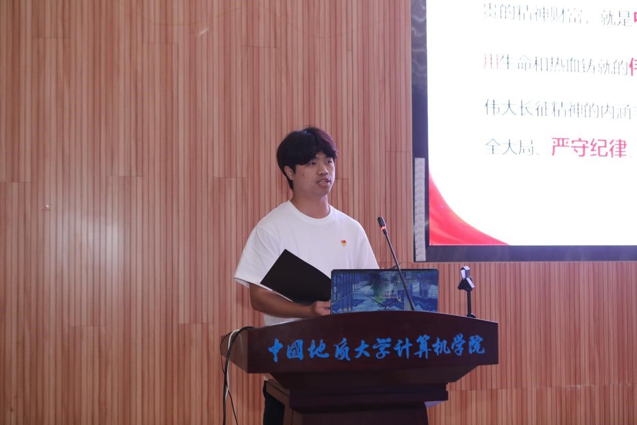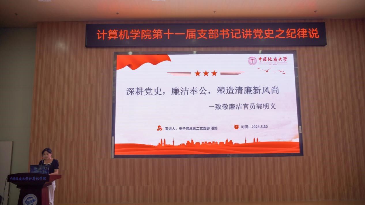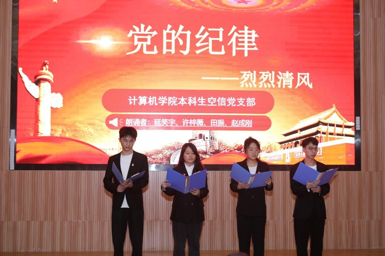 活动在雄壮的国歌声中拉开帷幕。学生党支部书记率先登场。电子信息第三党支部朱国强以刘邓大军的严明军纪为例,强调了纪律在军队建设中的重要作用。本科生信安党支部郭鹏顺则从新民主主义革命时期的党纪建设出发,强调了坚守初心、严明纪律的意义。本科生空信党支部延笑宇等多名成员以“党的纪律:烈烈清风”为题的诗歌朗诵,声情并茂地展现出对党廉政建设的歌颂。本科生计科第一党支部王诗敏则以延安廉政的故事为蓝本,深入剖析了党在推动廉政反腐方面的必要性和坚定决心。电子信息第二党支部潘灿通过讲述郭明义的故事,展现了廉洁奉公、无私奉献的崇高精神。电子信息第一党支部胡长浩深刻阐述了铁纪在长征这一伟大的历史事件中的关键作用。在成人av 空间信息工程党支部与经济管理学院生态文明研究生样板党支部成员的精心编排下,以一场独具特色的话剧将现场气氛推向了高潮,生动诠释了“亲民爱民、艰苦奋斗、科学求实、迎难而上、无私奉献”的“焦裕禄精神”。