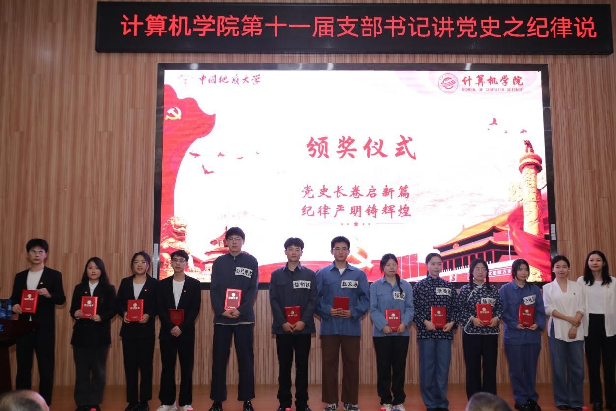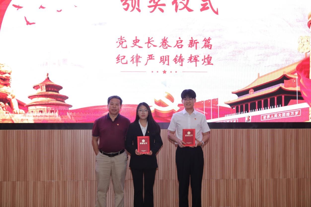 在示范党课环节,马钊老师以《清风徐来,廉洁花开》为题,深入浅出地阐述了廉洁自律的重要性,引导大家从现在做起,从身边小事做起,从遵守考试纪律、坚持推优评奖原则等日常学习工作生活做起,扣好廉洁自律“第一粒纽扣”。校友代表肖飞龙以《始终坚持严的基调 全面加强纪律建设》为题,带领大家深刻学习领悟习近平总书记关于党的自我革命的重要思想。李国昌书记原原本本领学了《中国共产党纪律处分条例》中关于政绩观的修订内容,分享了习近平总书记在延安梁家河、河北正定等地工作期间造福人民的故事,希望青年学生自觉学习党规党纪,切实践行造福人民的政绩观,并在新时代的新征程上不断建立新功。示范党课结束后举行了隆重的颁奖仪式。