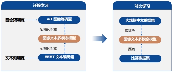为了获得更好的性能表现,并降低模型训练成本,我们指定了“迁移学习——对比学习”的解决方案:以预训练的图像编码器、文本编码器初始化CLIP模型,接下来使用图像-文本对数据集进行“预训练-微调”,得到多模态融合模型。