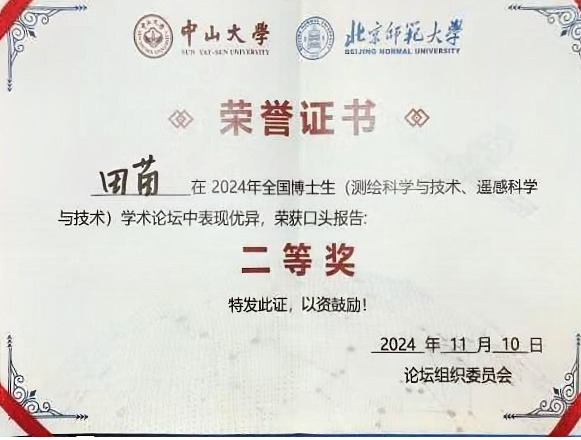 团队研究生田苗博士、吴麒瑞博士分别做了题为“地质知识图谱的构建及推理应用”,“融合知识图谱与机器学习的灾害易发性评价”的报告,并在优秀报告奖评选中分获二等奖和优秀奖。