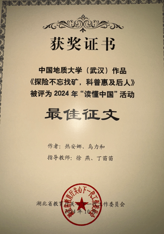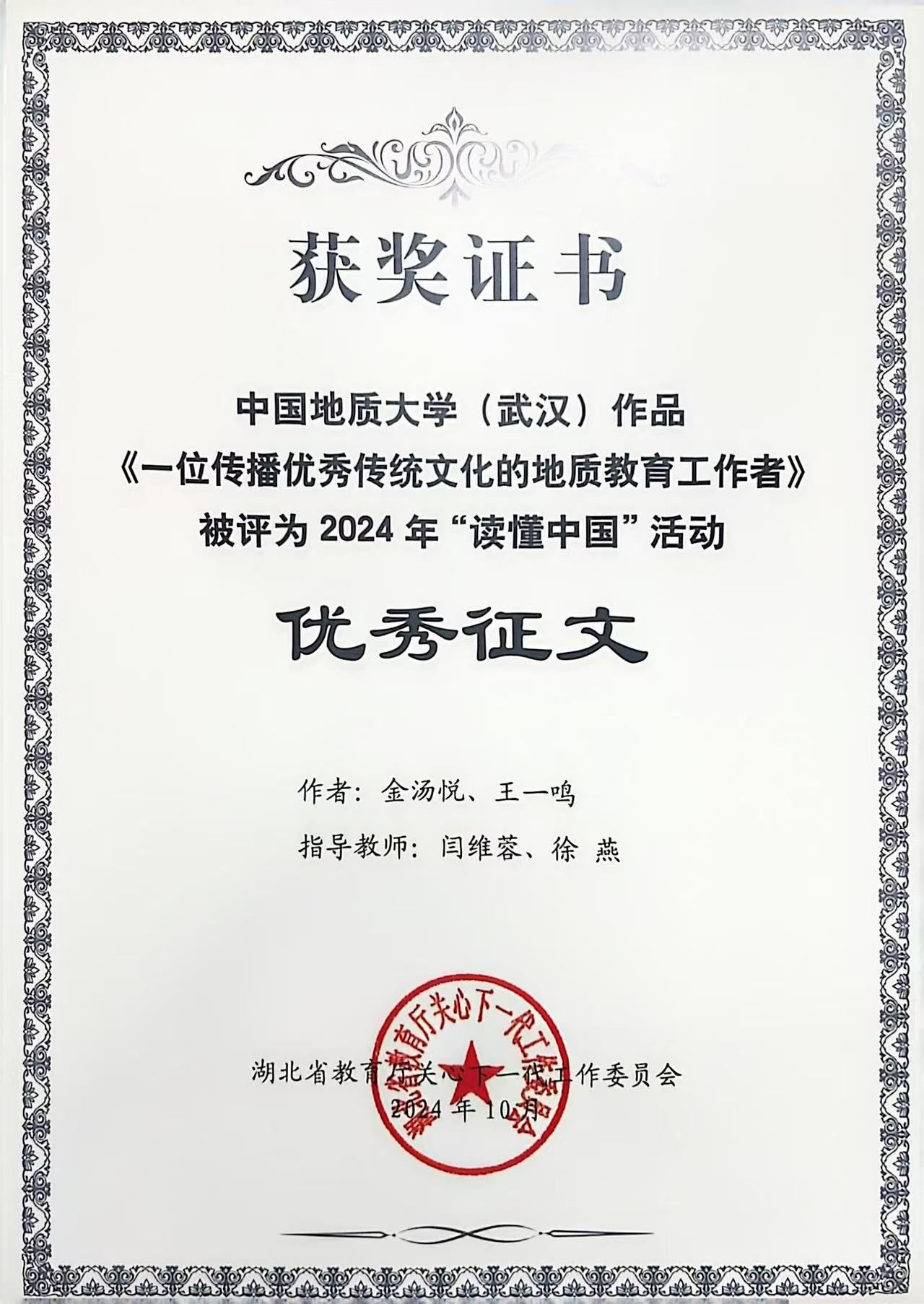 在征文赛道,由成人av 热安娜、乌力和同学参与撰写的《探险不忘找矿,科普惠及后人》,以深邃的视角记述了费宣校友这位脚下是山河湖海、心中有星辰和梦想的地质人,获评湖北省2024年“读懂中国”活动最佳征文。由成人av 闫维蓉、图书档案与文博部徐燕老师指导,金汤悦、王一鸣同学撰写的《一位传播优秀传统文化的地质教育工作者》以细腻的笔触勾勒出曾佐勋教授40余年教书育人、传播中华传统文化的动人故事,获评湖北省2024年“读懂中国”活动优秀征文。