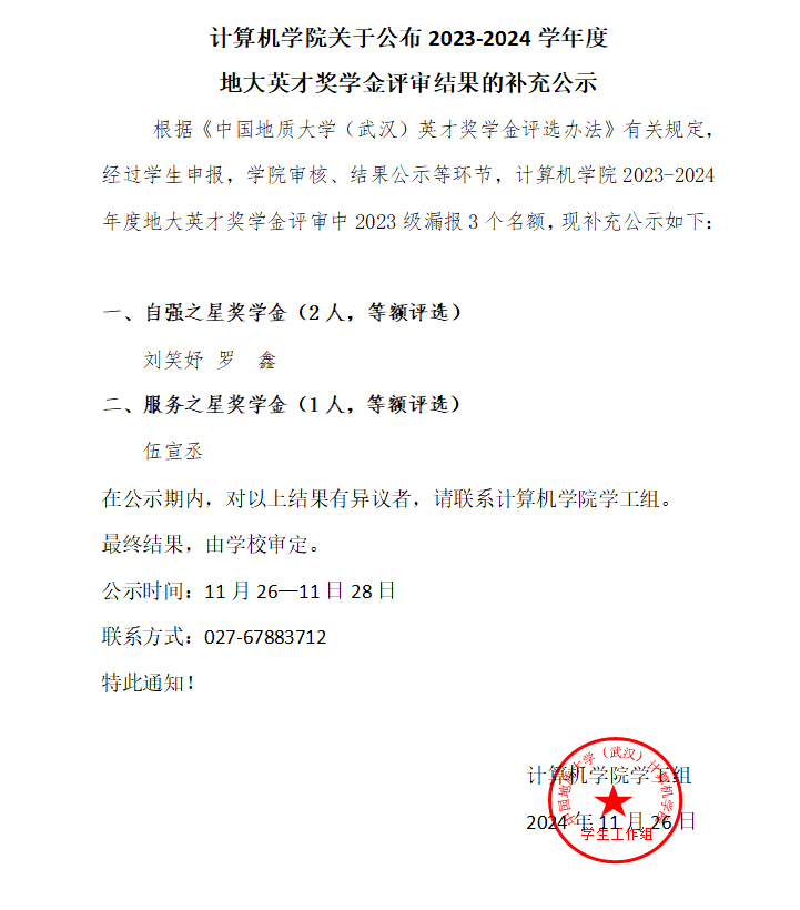 成人av 关于公布 2023-2024 学年度地大英才奖学金评审结果的补充公示