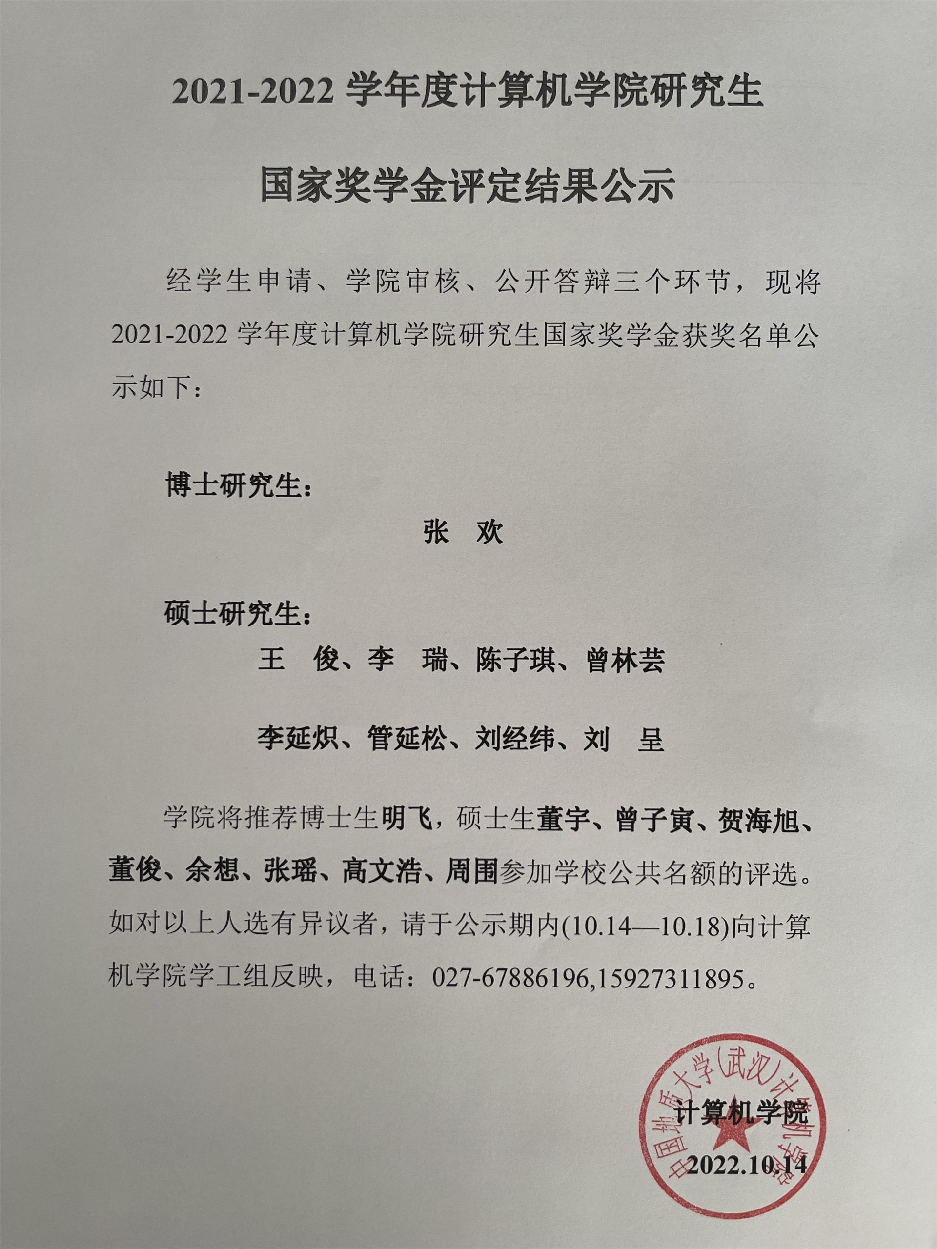 2021-2022学年度成人av 研究生国家奖学金评定结果公示