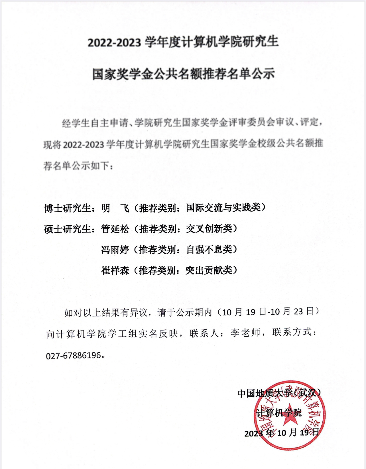 2022-2023学年成人av 研究生国家奖学金公共名额推荐名单公示