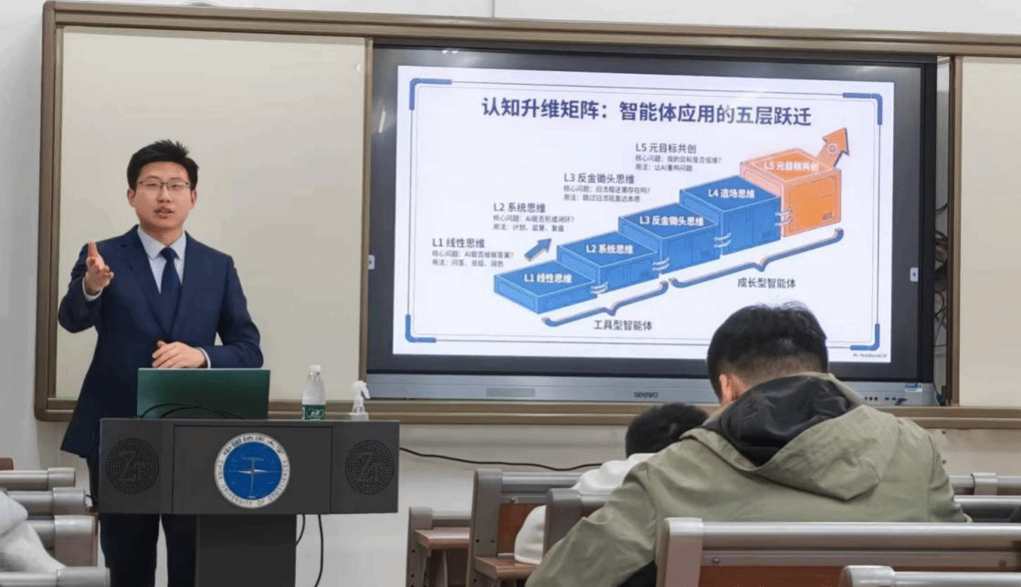面对AI工具,使用者的认知水平决定了智能体的段位。牛老师向同学们展示了智能体应用的“五层跃迁矩阵”。