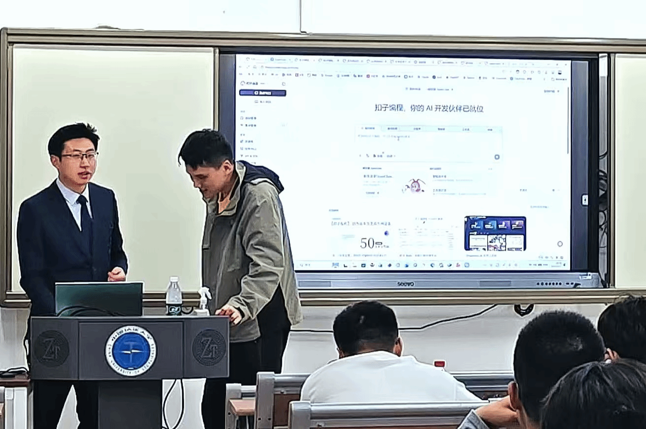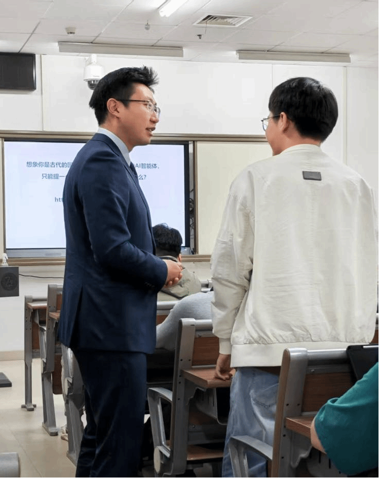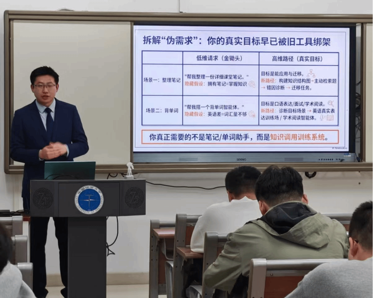 在实操指导环节,牛老师将理论落地,与在场学生进行了一场生动且深度的互动。他向同学们抛出了一个极具启发性的情境设问:“想象你是古代的国王,拥有一个无所不能的AI智能体,只能提一个要求,你最想让它为你做什么?”