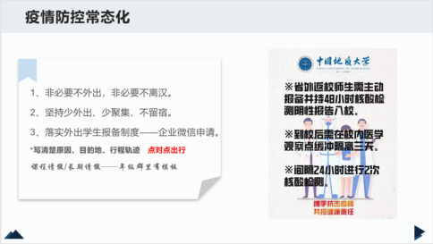 最后,闫维蓉做梳理总结,首先,闫维蓉重申了学院关于疫情防控的常态化管理要求,叮嘱同学们非必要不外出,非必要不离汉,同时再次就外出申请的流程进行了强调。其次,闫维蓉通报了各班的青年大学习的完成情况,呼吁大家积极提升自己的思想政治素养。最后,闫维蓉就年级各项日常事务的办理渠道进行了介绍,并叮嘱同学们有问题及时向辅导员老师及相关部门老师反应。
