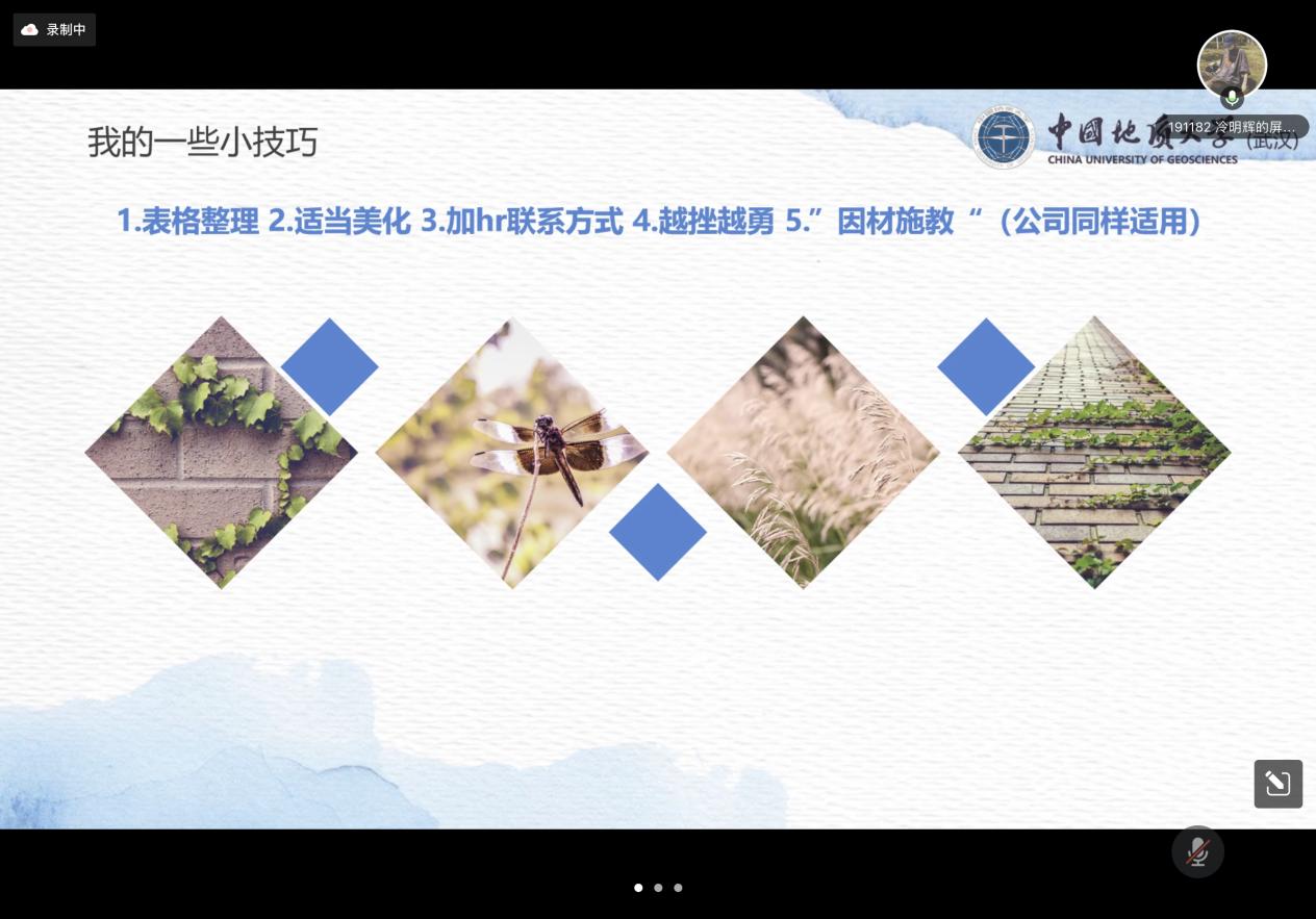 冷明辉先是告诉同学们应当从老师、家长等各个方面听取建议,并根据自身情况决定好适合自己的岗位及公司等。紧接着提醒同学们应当在做好简历、收集招聘信息等地方做好准备。最后从笔试、面试方面向同学们讲述了自己的技巧经验。