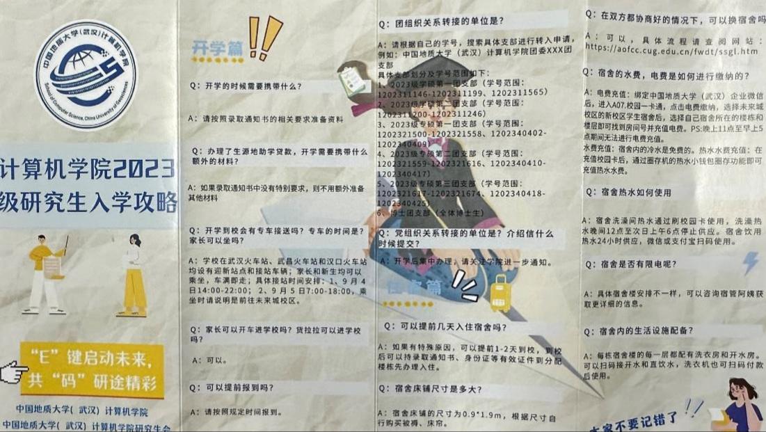 “E”键启动未来,共“码”研途精彩。为了帮助新生报到畅通无忧,学院精心制作了“成人av 2023级研究生入学攻略”,攻略分为开学篇、学习篇、生活篇三部分,帮助同学们全方位了解开学时需携带的相关材料、课程培养、团组织关系转接等事项,同时一一解答关于体育馆预约、宿舍水费电费缴纳、热水使用、宿舍管理等问题,帮助新生尽快熟悉校园环境。