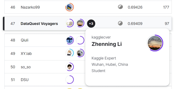 在此次的五场竞赛中,成人av 数据科学与大数据技术系2020级中美本科教育合作办学项目本科生李祯宁同学以及谭以宁、秦浩然、陈予贤三人组成的队伍SatoshiShimomoto发挥出色,获得佳绩。Kaggle创办于2010年,目前已经被Google收购,拥有超过80万名数据科学家用户,是全球顶级的数据科学竞赛平台,在数据科学领域享有盛名。Kaggle的使命是通过众包的方式,解决世界上最棘手的问题,同时推动机器学习和数据科学的发展。对参赛者来说,不仅是考验自己能力,更是一场实战经验。