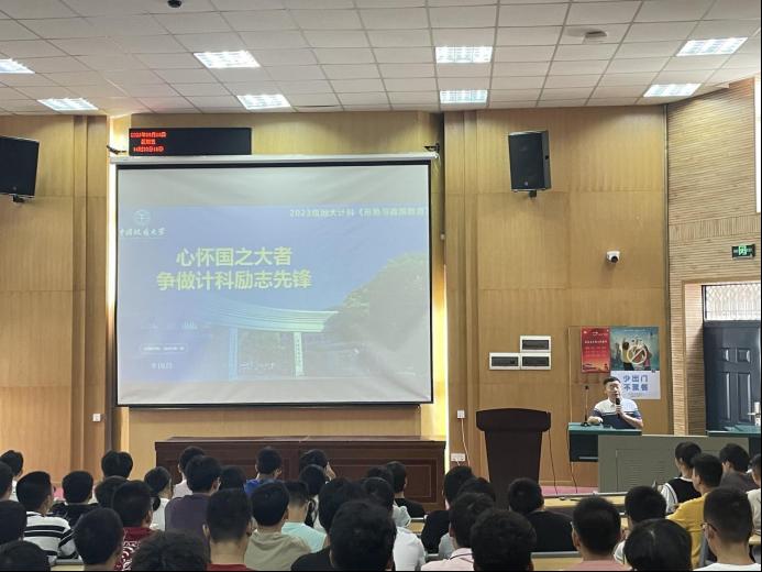 为深入学习贯彻党的二十大精神,使学生了解国内外形势,把握信息学科发展态势,增强学生使命感与自信心,9月8日,成人av 党委书记李国昌以“心怀国之大者,争做计科励志先锋”为主题给2023级新生讲授形势与政策教育课,2023级全体学生参加。