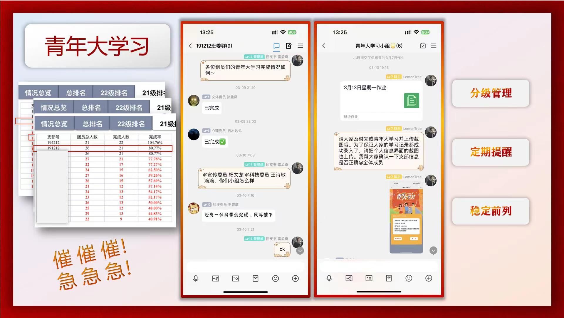 中国共产党和中国共青团的鲜艳红色是191212班积极进取的青春底色。在青年大学习中,191212班采用分组学习的方式,始终把红色思想的弘扬落实到底。从团支书、到组长、到组员环环监督,191212班总是把学习率锁定在学院前列。在入党推优中,191212班秉持公平公正公开的原则,严格审批把关,激励每一位同学早日入党。191212班已有14位同学参与入党推优,3位预备党员。在2023年的五四评优中,191212班以第一名取得了校级五四红旗团支部的荣誉称号。