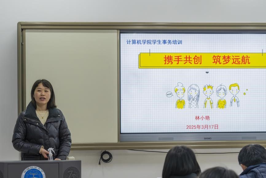 在本次讲座中,林小艳以“携手共创,筑梦远航”为题,从当前的计算机行业形势出发、解读国家政策,围绕“科技创新与产业升级”,为学生们的未来规划和发展提供了建议。接着,林小艳从“学生干部应知”“学生干部应会”“学生干部应懂”三个方面为在场学生干部展开培训,以提高学生干部的综合能力。