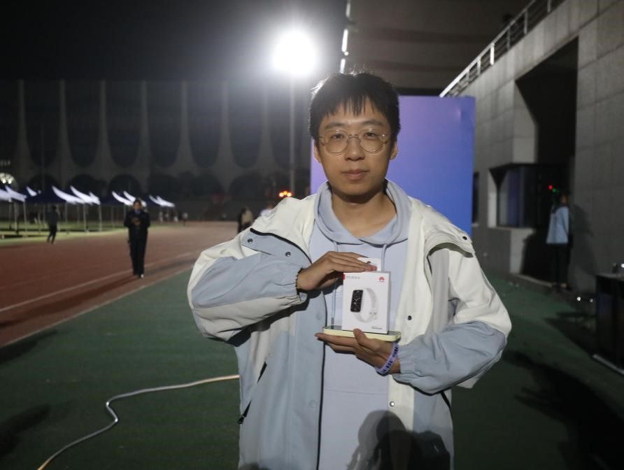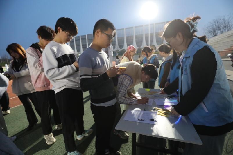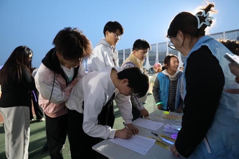 19:10,荧光夜跑正式开跑。参与者们沿着操场赛道奔跑,手中荧光手环的光芒与星光相互交织,勾勒出一道道绚丽的轨迹。不少同学打开步道乐跑APP或其他运动软件记录运动轨迹,在完成2km跑步指标后,满心期待地前往抽奖摊位,渴望赢取惊喜奖品。
