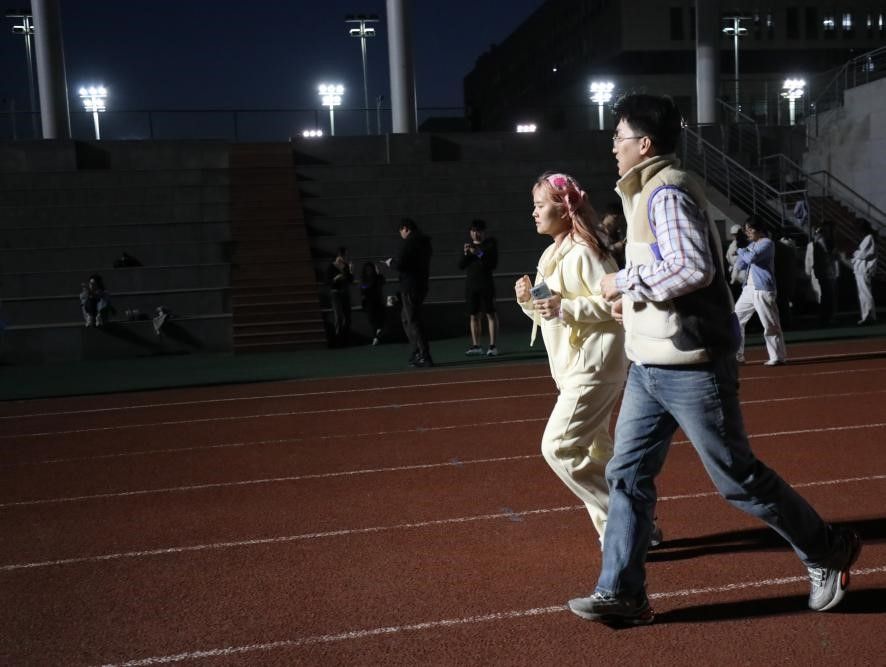 活动伊始,现场气氛热烈非凡。18:30刚过,师生们来到操场签到入场,领取荧光手环后,纷纷与伙伴拍照打卡,记录这一美好时刻。19:00,热身环节开启,动感的音乐响起,大家跟着节奏尽情舞动,迅速摆脱了“开学瘫”,为接下来的运动做好准备。