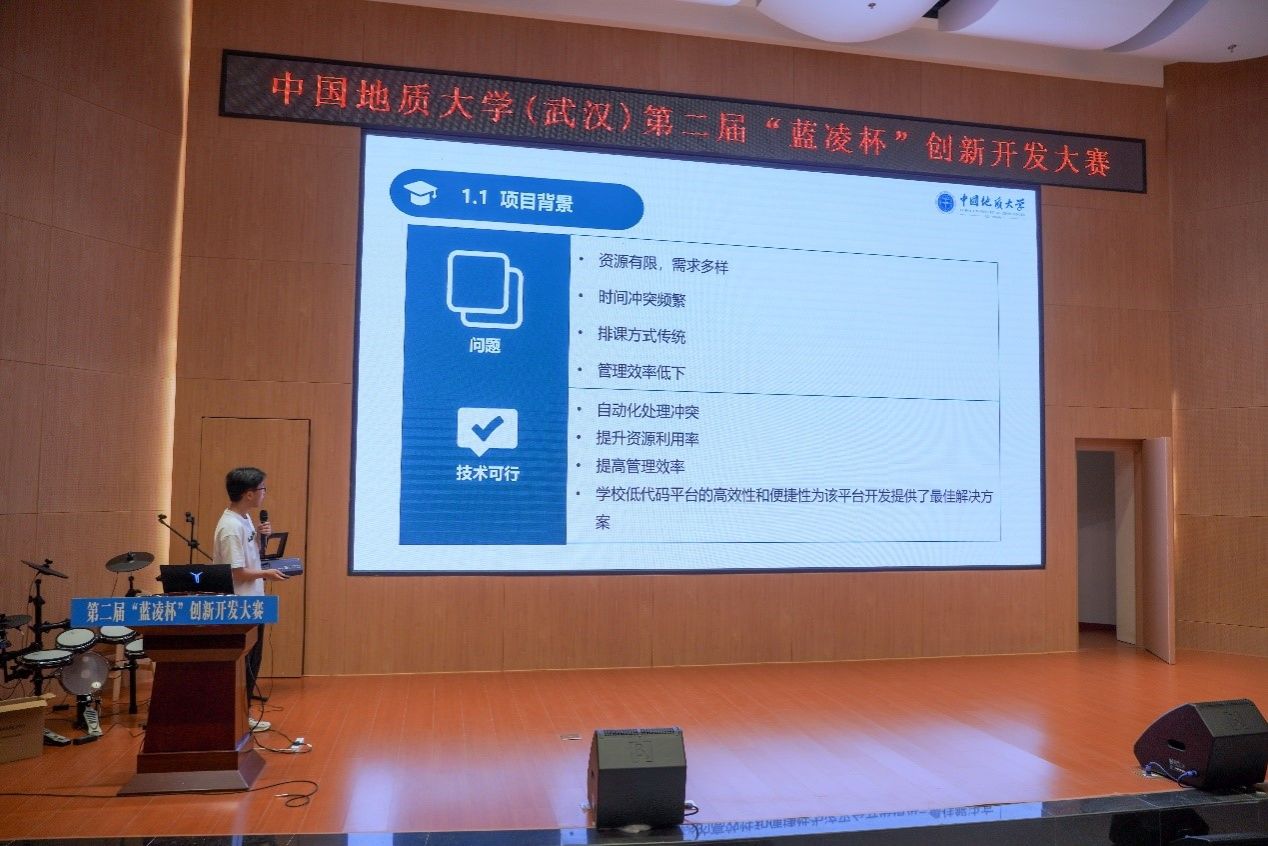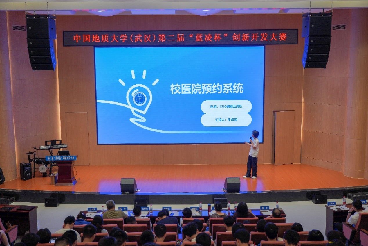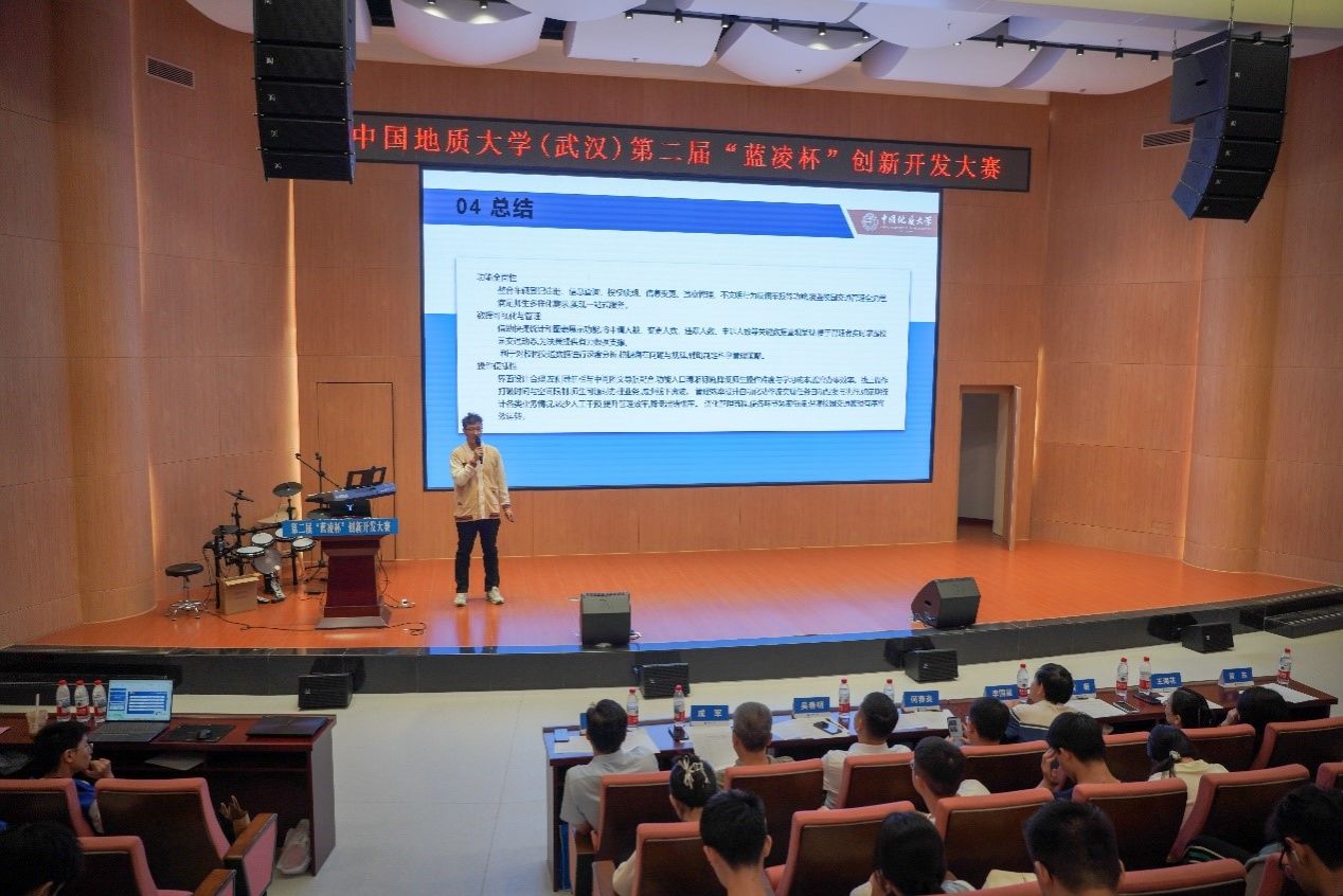 比赛正式开始,10支决赛队伍依次上台答辩。小队成员们精神饱满、细致生动地讲述了小队的开发进程与最终成果,充分展现了地大学子热情洋溢、精益求精的精神风貌。