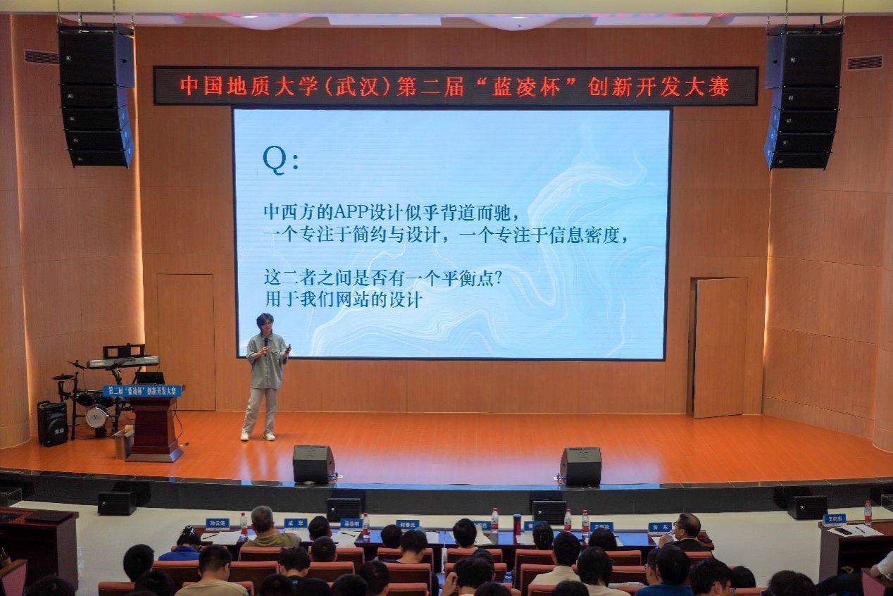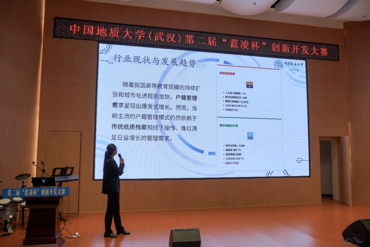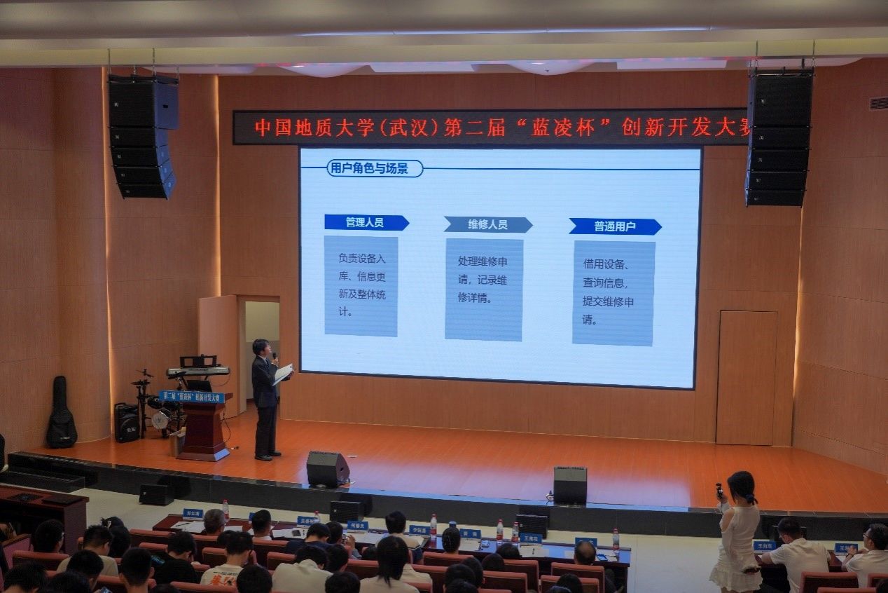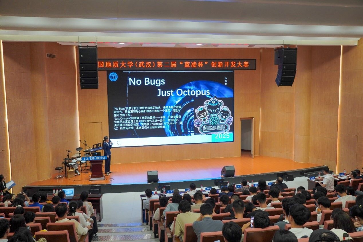 比赛正式开始,10支决赛队伍依次上台答辩。小队成员们精神饱满、细致生动地讲述了小队的开发进程与最终成果,充分展现了地大学子热情洋溢、精益求精的精神风貌。