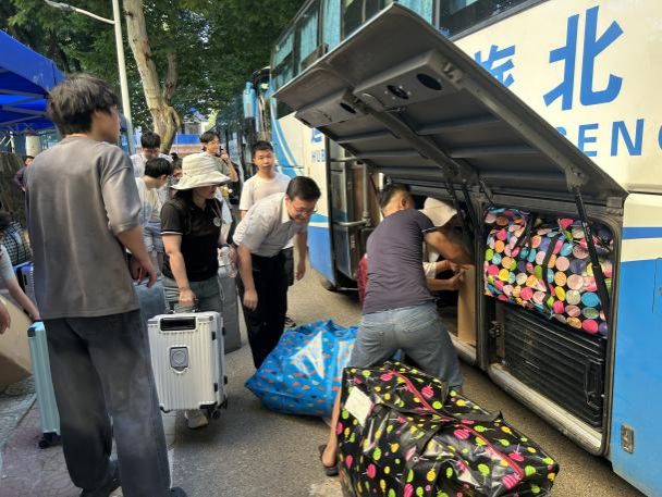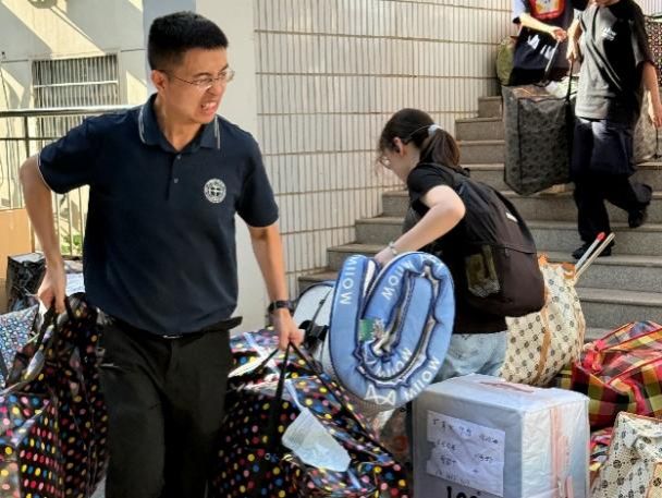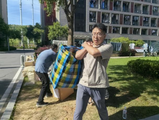 同学们提前将个人行李打包、整理完毕,早早在楼下集合,随着搬运车辆陆续到达,大家自发排队、协作配合,将纸箱、背包等一一传递上班车,摆放得井井有条。虽然天气闷热,但在老师们的带领下,同学们干劲十足,整个搬迁现场忙而不乱,秩序井然。