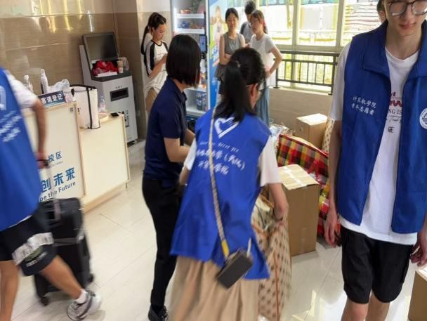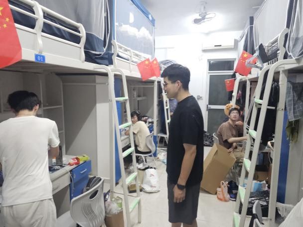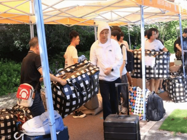 大巴驶入校园,在同学们即将入住的宿舍前,橙色的遮阳棚早已搭好,身穿蓝色马甲的志愿者们静候多时。多辆搬运车辆将学生行李送到宿舍楼下,老师和志愿者们积极帮助2024级计科学子们搬运行李,引导方向;宿管阿姨给大家发放钥匙,认真细致地登记信息;同学们团结协作,将一件件沉重的行李搬进新宿舍,开启一段全新的学习与生活旅程。