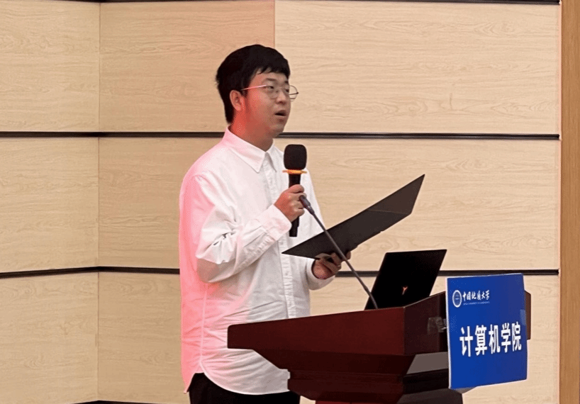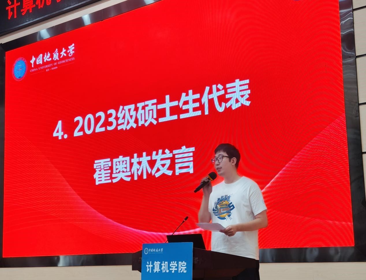 高年级学生代表、2023级硕士生霍奥林发言。他结合在校六年的学习成长经历,作了关于“不忘初心、勇于尝试、审视未来、劳逸结合”等方面的分享,鼓励新生坚定信念、把握机遇、勤于思考、全面发展,在充满活力与底蕴的成人av 勇敢追梦、踏实圆梦,以实际行动书写属于自己的地大计科故事。