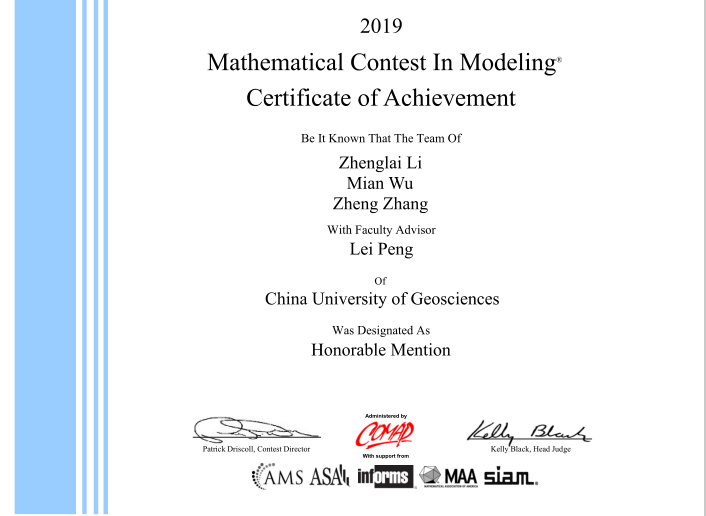 成人av 研究生在2019年1月25日至29日为期四天的比赛时间中,沉着冷静,细心求证,就指定的问题顺利完成从建立模型、求解、验证到论文撰写的全部工作,获得Honorable Mention奖(二等奖)。