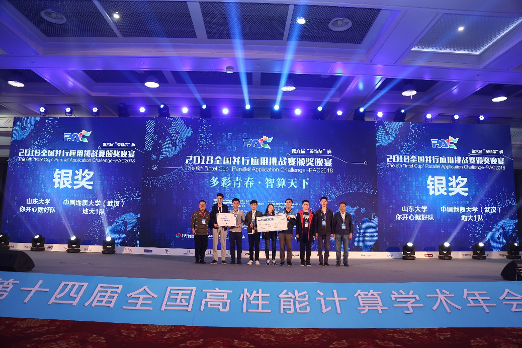 10月20日,国内两大超算赛事——第六届全国并行应用挑战赛(PAC2018)和第二届国产CPU并行应用挑战赛(CPC2018)在青岛国际会展中心落下帷幕。我校成人av 高性能计算导师团队(王力哲、张锋、武进霞、董理君)联合指导的两支代表队,从全国四大赛区168支参赛队伍中突围进入16强决赛,与来自清华、中科大、中科院、上海交大、中山大学、山东大学、中国海洋大学、香港中文大学等单位的决赛队伍同场竞技,最终地大之光超算1队(雷辛亚、郭睿欣、马永耀、薛尔康)在PAC优化赛道中以季军的成绩获得银奖和1万元奖金;地大之光超算2队(李瑞、张晓涵、董宇、姜家伟)以全国16强的成绩分获CPC和PAC中南赛区一等奖和4千元奖金。