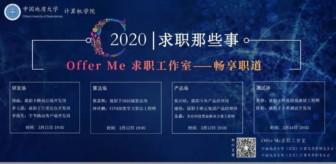 3月11日至3月14日晚,成人av 研究生会“offer me 求职漫谈”经验分享系列活动成功举办。疫情当前,停课不停学,隔离不隔爱。活动共邀请11位学长学姐在线分享求职经验,并深入讲解和剖析求职技巧。