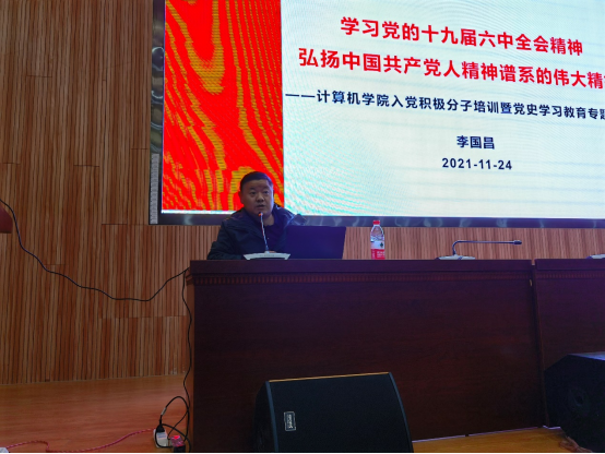 (通讯员:杨书睿)为学习贯彻党的十九届六中全会和习近平总书记七一重要讲话精神,深入推动党史学习教育,11月24日中午,学院党委书记李国昌为成人av 第29期入党积极分子主讲《学习党的十九届六中全会精神,弘扬中国共产党人精神谱系的伟大精神》专题党课。