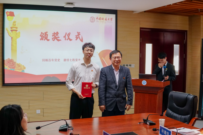唐忠阳书记为教工组优秀奖获得者代表颁发荣誉证书。