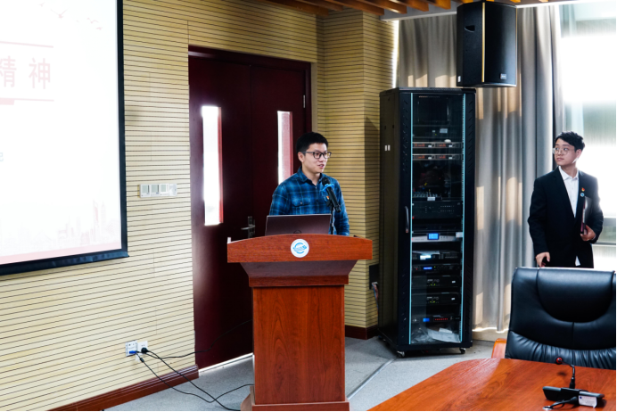 八位入围决赛的学生党支部书记依次进行演讲。2021级硕士联合党支部书记马海川分享的主题是“南泥湾精神”。