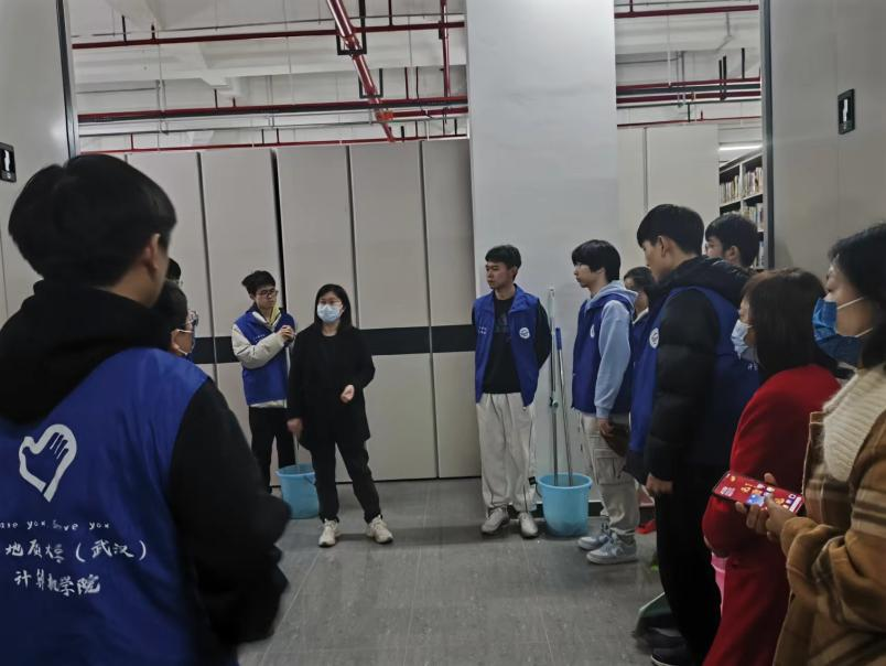 随后,同学们按照预先的分组安排,每四人一组,领取了必要的清洁工具,迅速到达指定位置开始工作。主要的任务包括扫地、拖地和擦拭书架等。扫地的同学不漏掉任何一片纸屑;擦拭的同学深入书架的每一个角落;摆放的同学确保每一本书籍都放置到指定位置,每个同学都明确各自分工,相互协作,有条不紊地进行着。