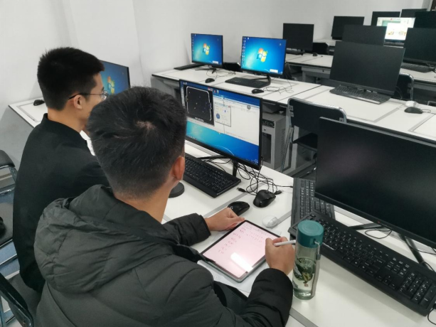 同学们在机房中开展对比实验(观察策略效果) 左:蔄宇飞右:刘志鑫