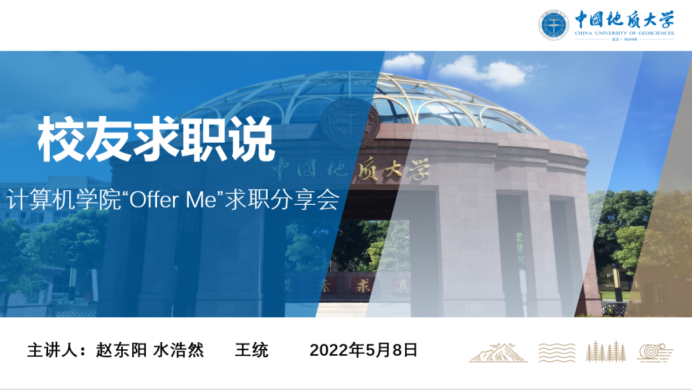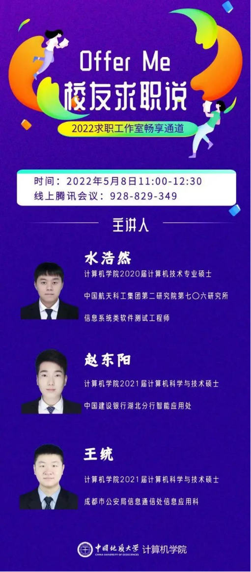 (通讯员:顾伟超)成人av “Offer Me”分享会之“校友求职说”专场活动于5月8日成功举行。本次活动邀请到3位来自不同行业的校友:2021届计算机科学与技术硕士专业毕业生赵东阳,目前就职于中国建设银行湖北分行;2020届计算机技术硕士专业毕业生水浩然,目前就职于中国航天科工集团第二研究院706所;2021届计算机科学与技术硕士专业毕业生王统,目前就职于成都市公安局,在线分享他们的职业选择、求职规划与工作感受。学院团委书记、研究生辅导员李欢欢,2019级辅导员闫维蓉以及200余名学生参与此次分享活动,李欢欢担任主持。