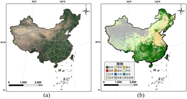 图2.(a)全国1米分辨率遥感影像,(b)全国1米分辨率土地覆盖图SinoLC-1。
