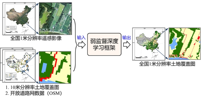 图1.基于弱监督深度学习的大范围高分辨率土地覆盖制图框架。