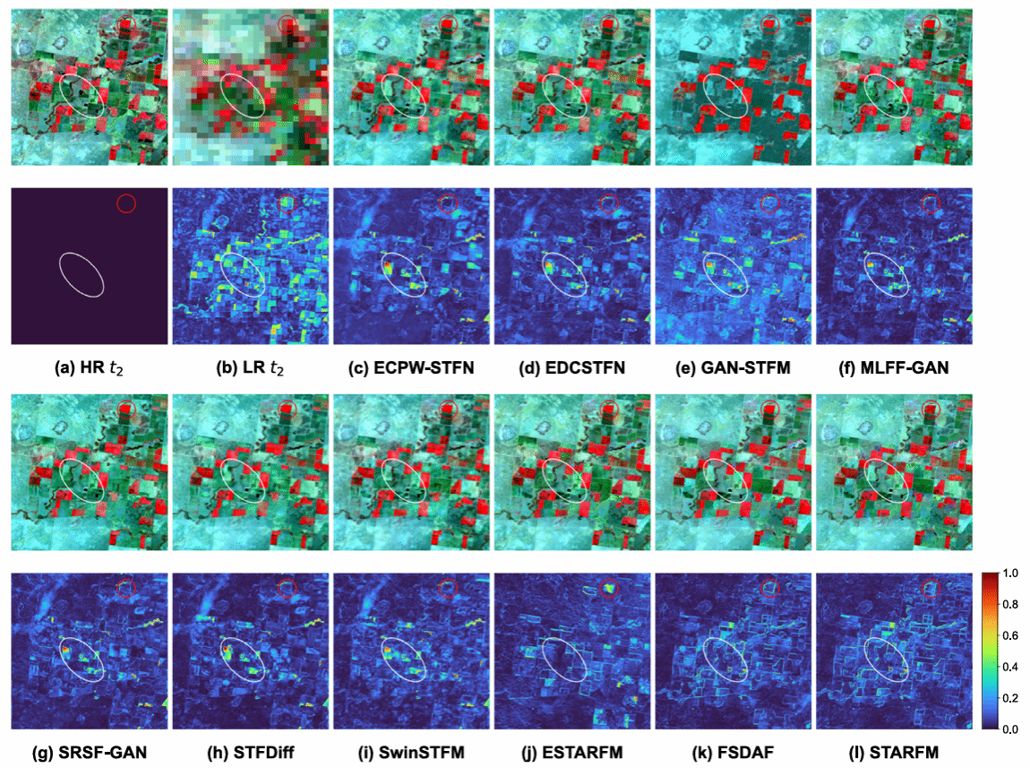 图A 不同时空融合方法在CIA数据集上的视觉对比结果。第一行和第三行显示真实值和预测的假彩色合成图像,第二行和第四行显示对应的差异图。