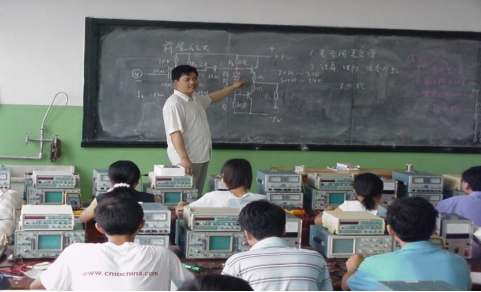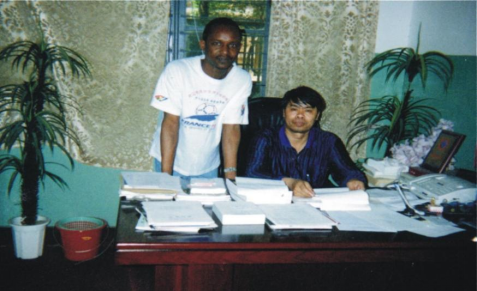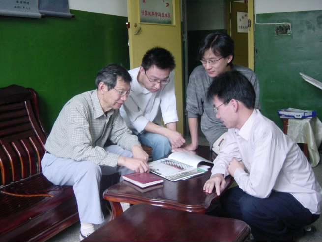计算机系主任康立山指导参加挑战杯赛的学生(2004年5月)